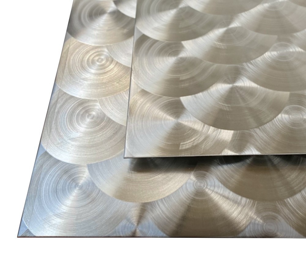 Startseite » Zuschnitte & Tafeln » Edelstahl » Edelstahlblech marmoriert D50 » Edelstahlblech | D50 kreismarmoriert Pfauenauge | 1,5mm